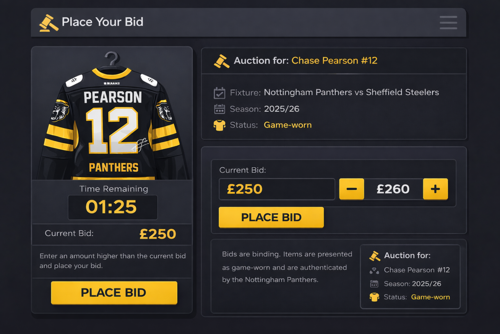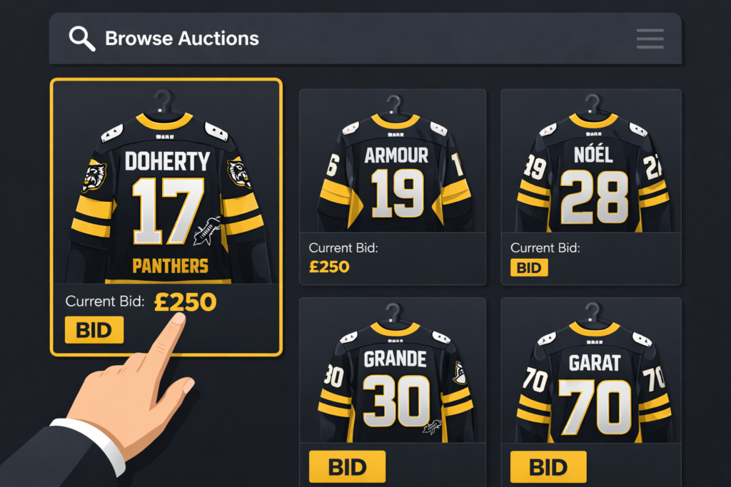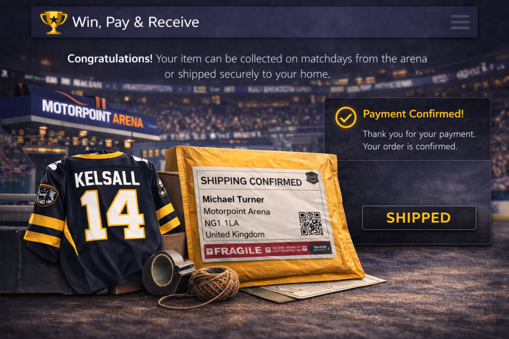 Winning items can be collected on matchdays from the Motorpoint Arena Nottingham (home of the Nottingham Panthers). Once the auction ends and you have completed your payment, you will receive confirmation with details on how to collect your item.